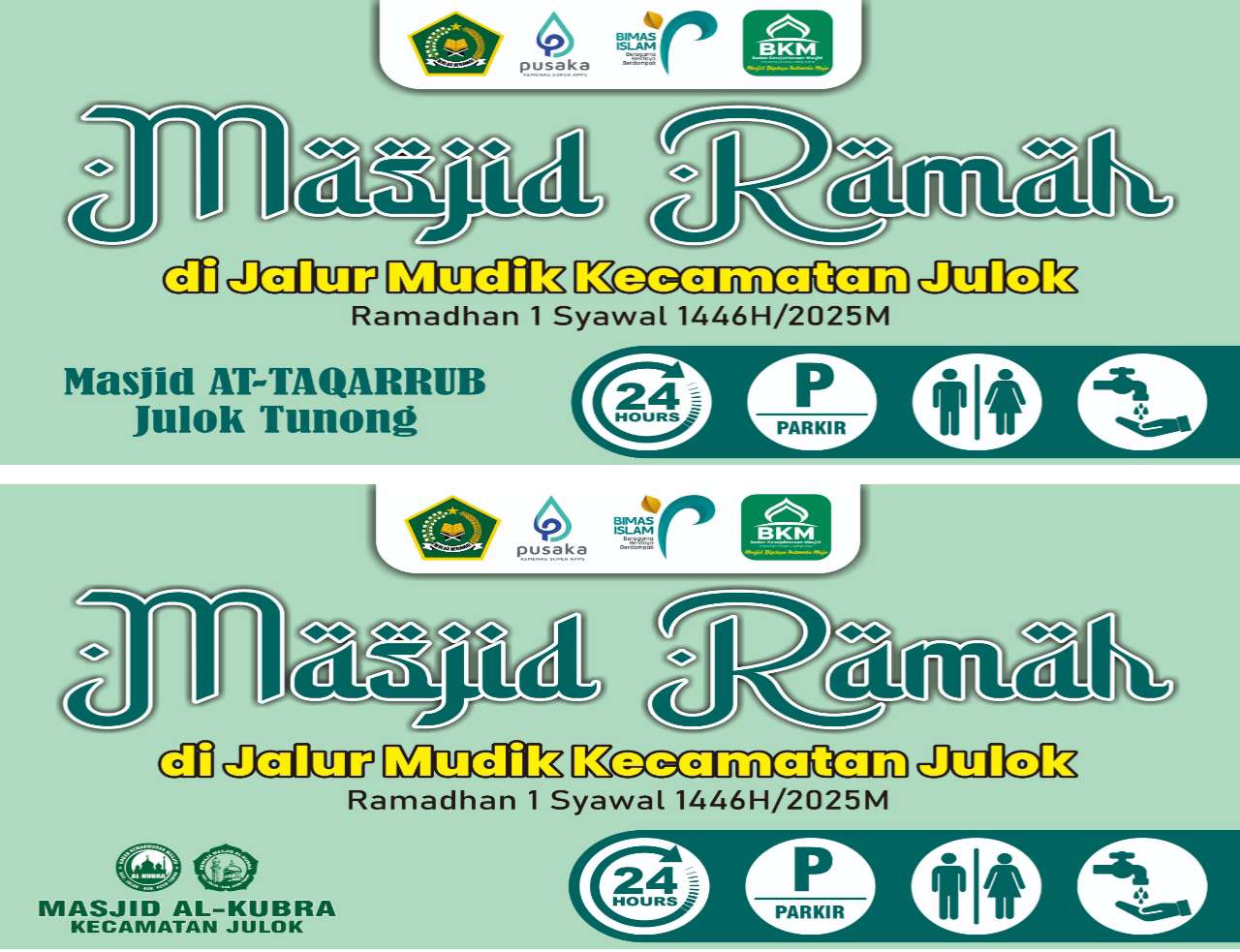 ACEH TIMUR - Kecamatan Julok merupakan salah satu jalur perlintasan para pemudik lebaran Idul Fitri 1446 H /2025, sebab itu Kementerian Agama (Kemenag) Aceh Timur melalui Kantor Urusan Agama Kecamatan Julok menetapkan dua Masjid sebagai Masjid Ramah di jalur mudik Kecamatan Julok.